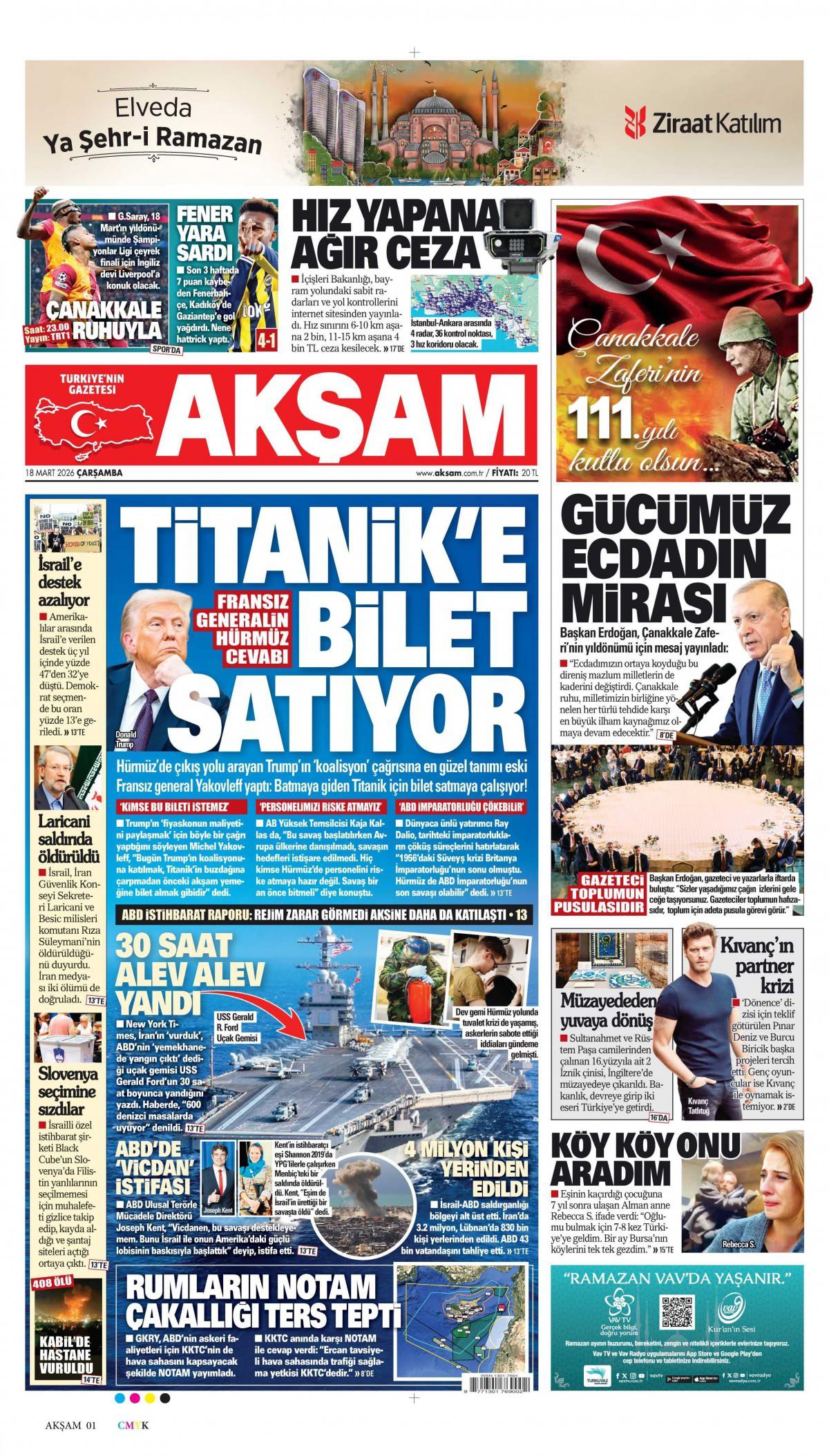 Akşam Gazetesi 19 Mart 2026 Günü Manşeti