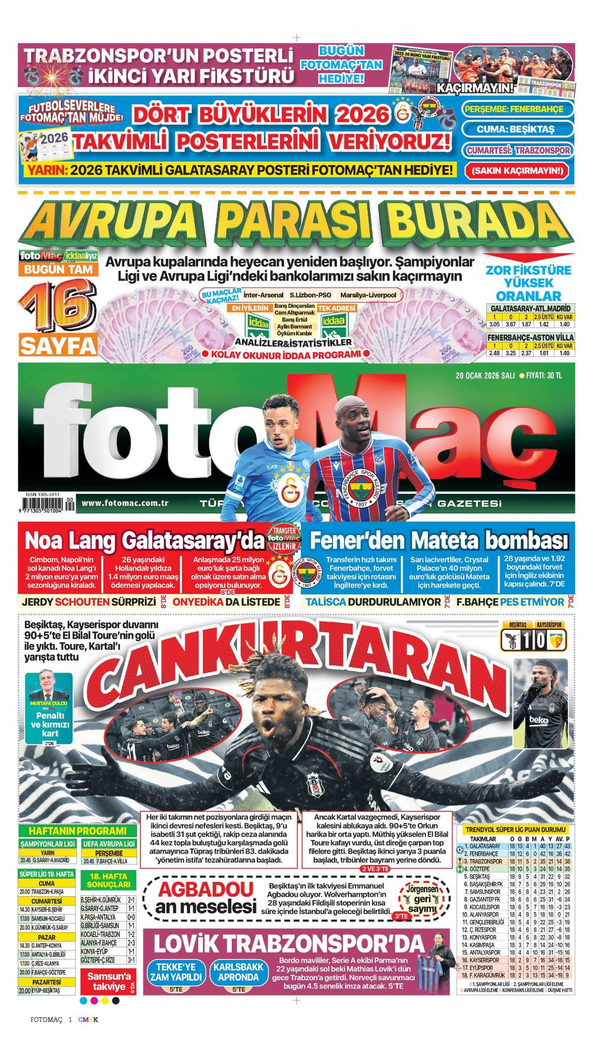 Fotomaç Gazetesi 21 Ocak 2026 Günü Manşeti