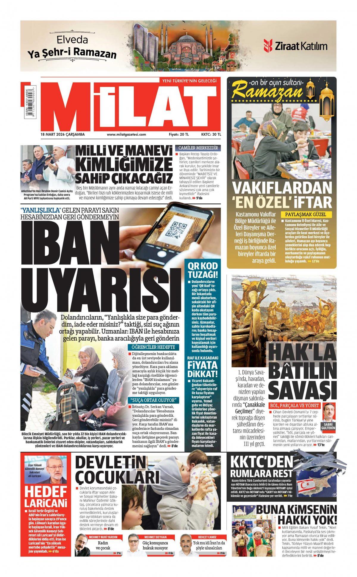 Milat Gazetesi 19 Mart 2026 Günü Manşeti